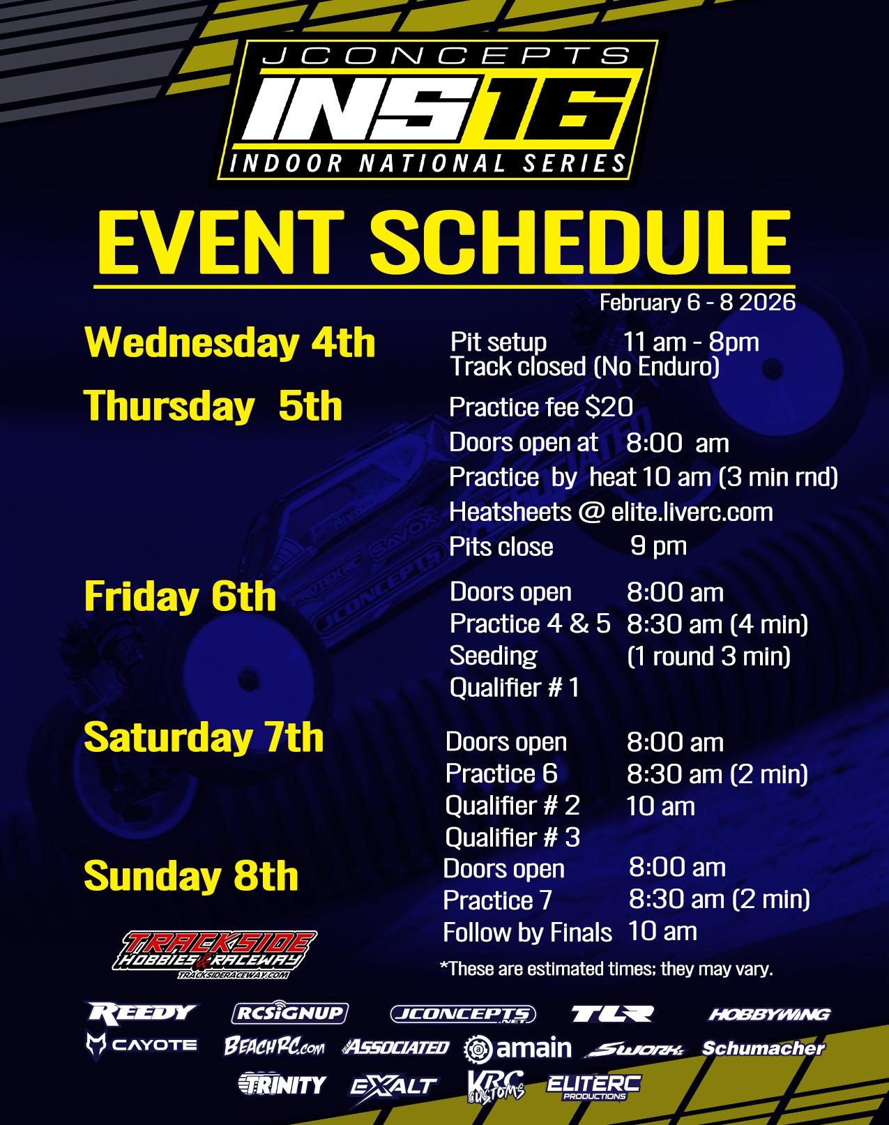 The INS and NCTS series’ are combining in to one to create a 5 race super series across both dirt and carpet surfaces. The 2026 calendar will consist of 3 dirt tracks and 2 carpet tracks starting the year at the famed Trackside Hobbies and Raceway and ending the festivities at the always amazing Hoosier RC Hobbyplex. The carpet events will take place at the extremely popular RC One Racing facility before heading to the beautiful Island Speedway in Muscatine, Iowa. For the first time, we will offer 2 events in the Summer with one being at the superb HobbyTown HobbyPlex in Omaha, Nebraska.