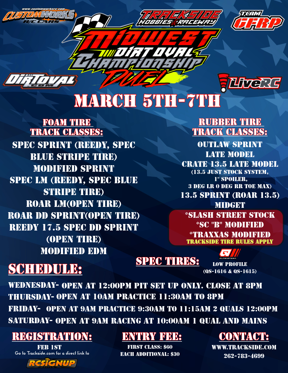 SATURDAY 3/7/26-Open at 9am racing at 10:00am 1 Qual and Mains